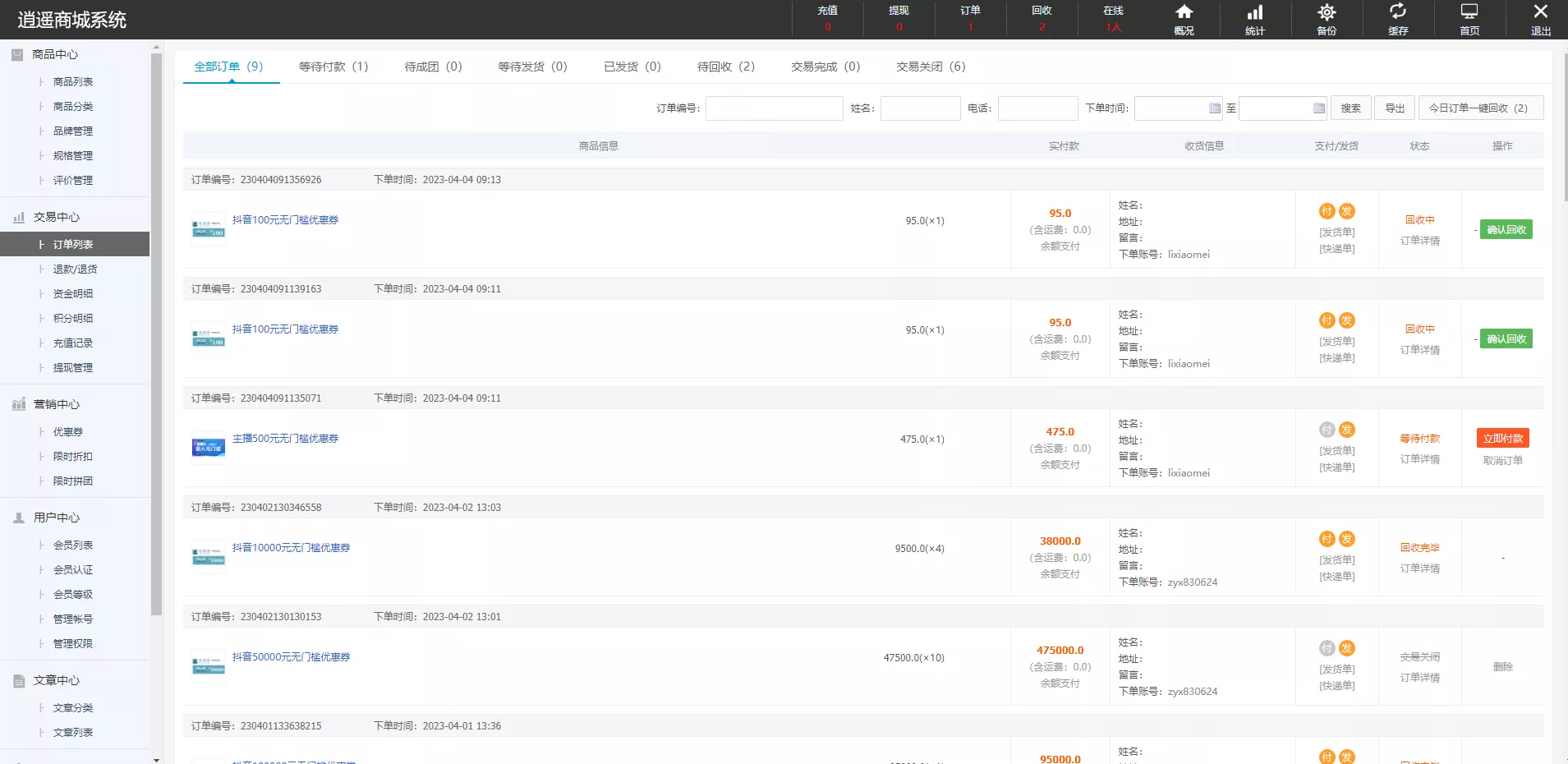 用户前端下单,后台订单可以直接回收,后台支持设置默认邀请码和抢卷时间限制