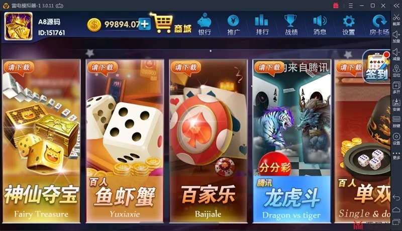 牛元帅、水浒、腾讯龙F斗、扎J花、捕鱼、百乐乐、鱼虾蟹、翻牌机、单双、红黑大战、百人牛牛跑得快、神仙夺宝、推筒子、卡五星麻将、百人推筒子、五子棋、拼天九、龙虎斗、名品汇、龙珠探宝、豹子王、一夜暴富、骰宝、地穴探宝、李逵捕鱼