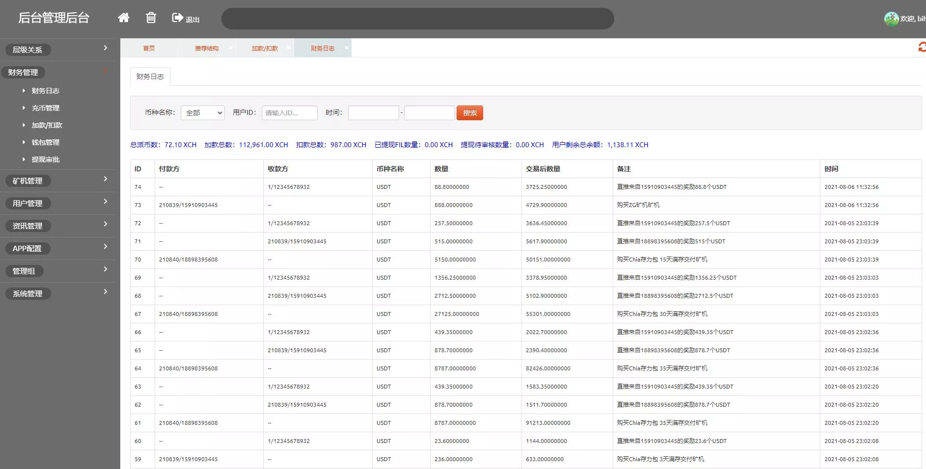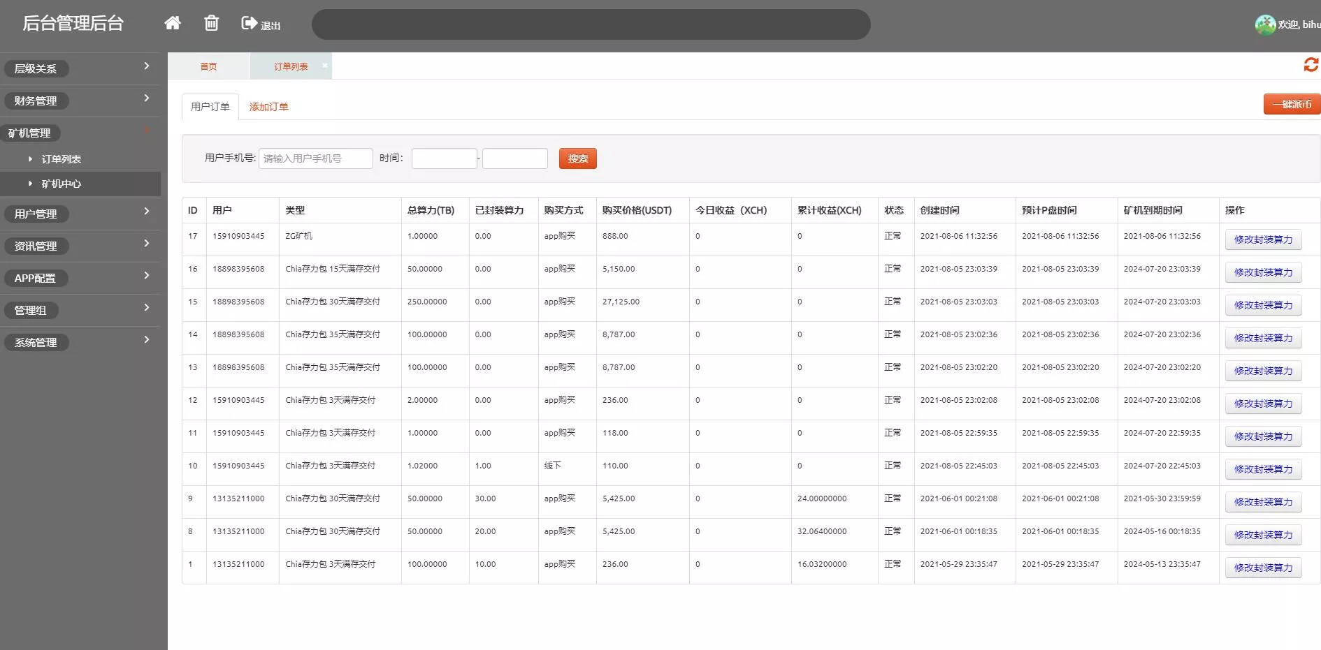 7、后台可管理会员信息、矿机信息、奖励信息